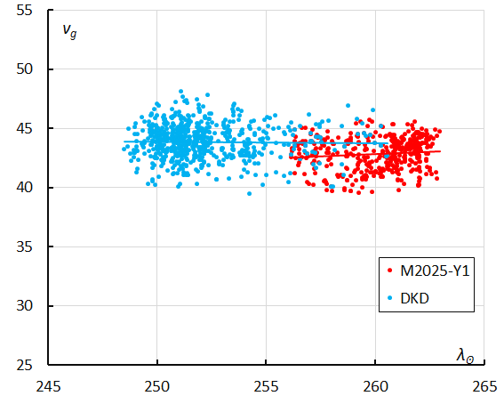 The radiant positions in Right Ascension (Figure 23) and Declination (Figure 24) visualize the radiant drift caused by the movement of the Earth. The radiant drift at the end of the activity of the December kappa-Draconids overlaps with the start of the M2025-Y1 activity and displays a similar trend. The geocentric velocity is comparable (Figure 25). The radiant drift in Sun-centered geocentric coordinates is caused by changes in the orientation of the orbital plane during Earth’s transit through the meteoroid stream. The December kappa-Draconids and M2025-Y1 align very well in Figures 26 and 27.