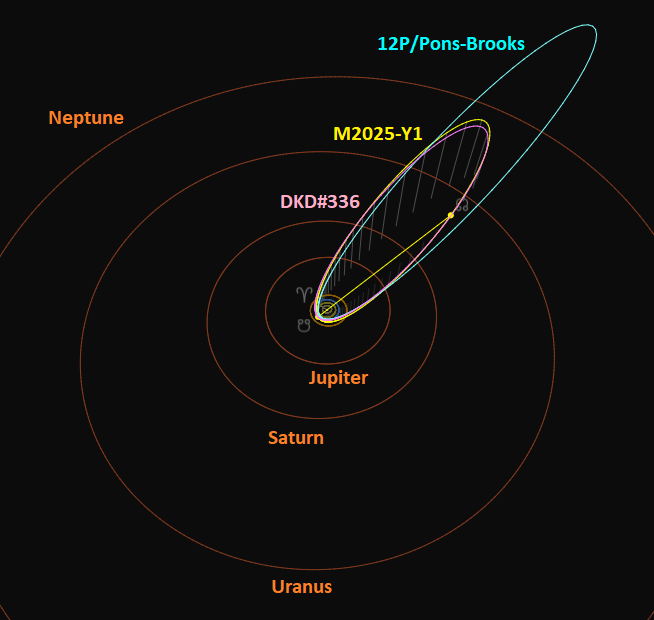 A search for possible parent bodies for the M2025-Y1 orbit resulted in the ten best matches listed in Table 7 with comet 12P/Pons-Brooks as most likely candidate, the same parent body of the December kappa-Draconids. The M2025-Y1 orbit fits with the 12P/Pons-Brooks orbit with DSH = 0.21 & DD = 0.11 & DJ = 0.14, the DKD#336 orbit fits with DSH = 0.21 & DD = 0.10 & DJ = 0.17. Figure 28 shows the three highly inclined orbits in space.
