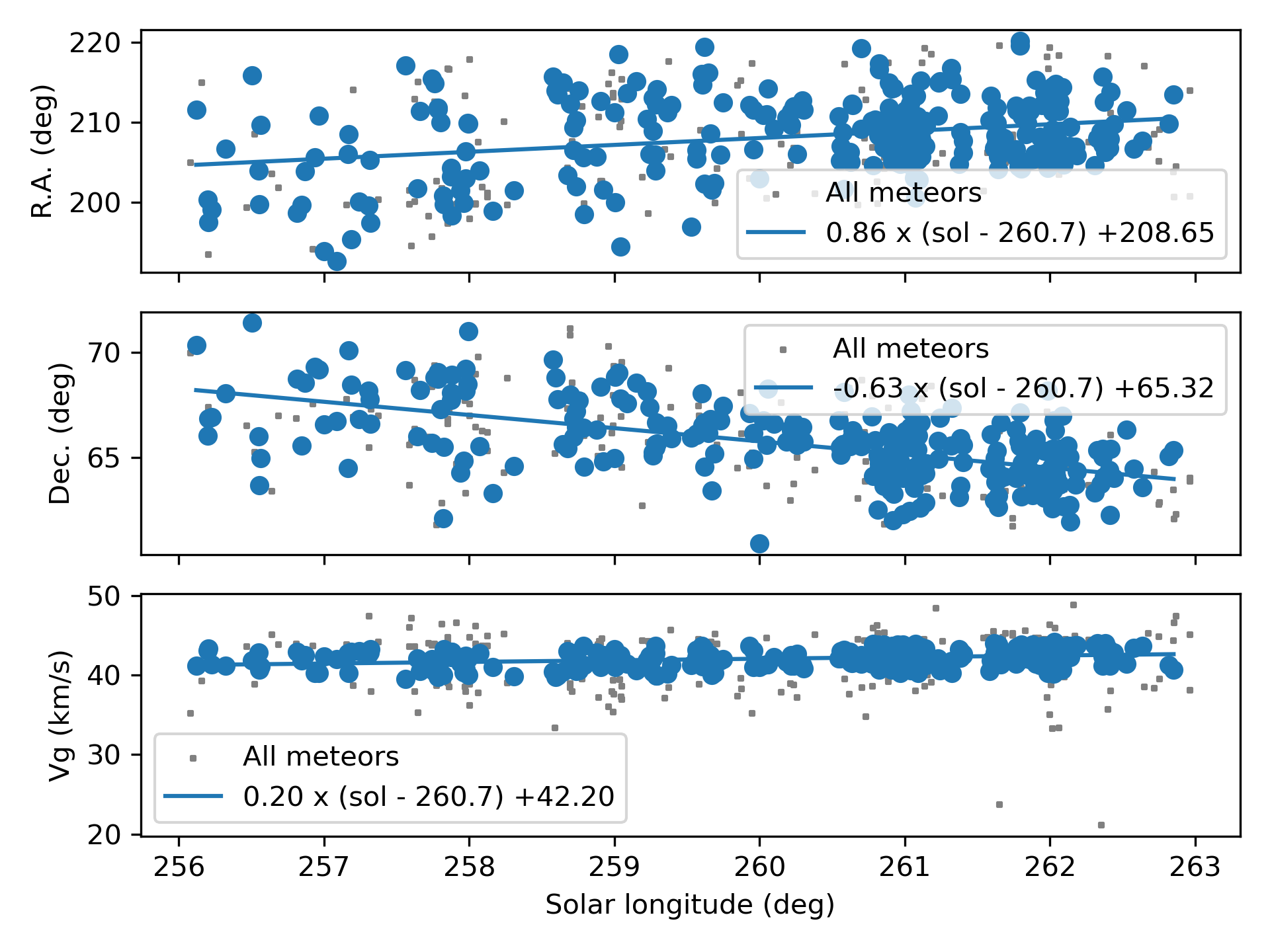 The orbital parameters of all the meteors that fit a D-criteria threshold class can be used to make line graphs and diagrams for the entire time interval of activity. Orbital elements and velocity may display changes in function of time, expressed in Solar Longitude λʘ. These changes in orbit orientation during Earth’s transit results in a radiant drift in Sun-centered geocentric ecliptic coordinates.
