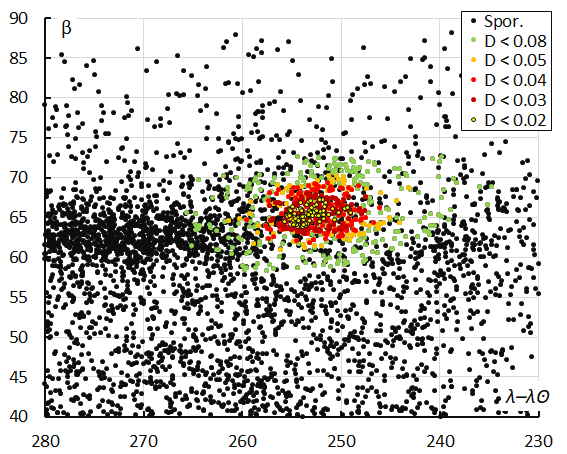 Figure 13 – The radiant distribution during the solar-longitude interval 256° – 263° in Sun-centered geocentric ecliptic coordinates, color-coded for different threshold values of the combined similarity criteria.