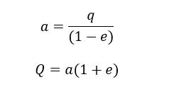 The eccentricity e defines the shape of the ellipse. A perfect circle has e = 0, e < 1 is an ellipse, e > 1 is a hyperbolic orbit, and e = 1 is a parabola. Some simple equations allow to compute some of the orbital parameters based on a few known parameters, like the semi-major axis a derived from the perihelion distance q and eccentricity e, or the aphelion distance Q derived from semi-major axis a and eccentricity e: