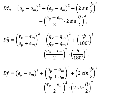The three different discriminant criteria can now be calculated from the following equations, with DSH for the Southworth Hawkins criterion (1963), DD for the Drummond criterion (1981) and DJ for the Jopek criterion (1993):