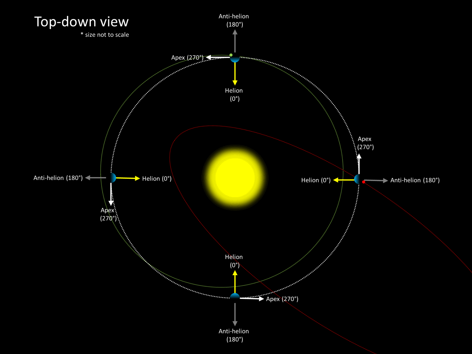 Figure 4 – Illustration of the Sun-centered ecliptic coordinate system with the Earth moving on its orbit in the direction of the Apex. (Credit GMN).