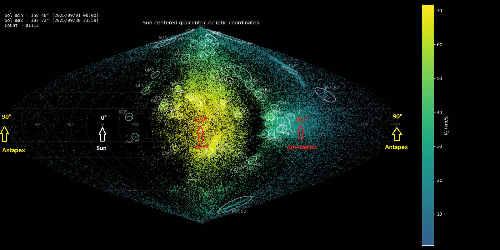 Figure 3 – GMN radiants for September 2025 plotted in Sun-centered Ecliptic Geocentric coordinates (SCE).