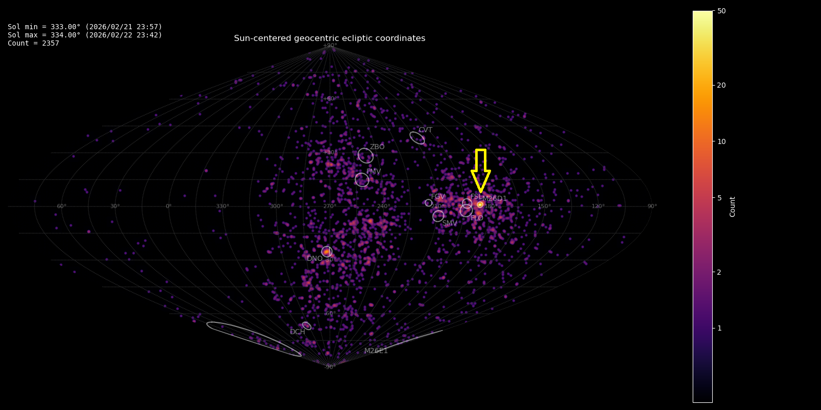 Figure 1 – Radiant density map with 2357 radiants obtained by the Global Meteor Network during 21–22 February, 2026. The position of the M2026-D1 radiant in Sun-centered geocentric ecliptic coordinates is marked with a yellow arrow.