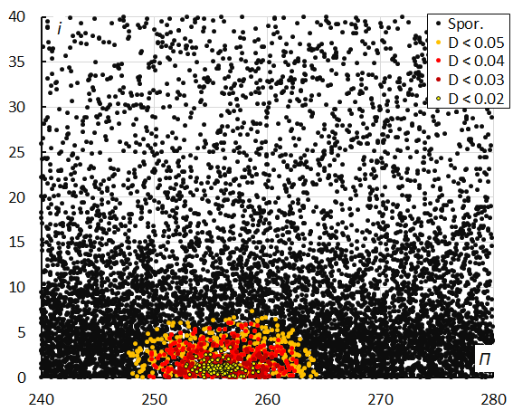 Figure 13 – Inclination i versus the longitude of perihelion Π color-coded for different classes of D-criteria thresholds, for λʘ between 326° and 341°.