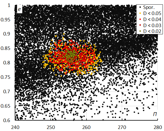 Figure 14 – Eccentricity e versus the longitude of perihelion Π color-coded for different classes of D-criteria thresholds, for λʘ between 326° and 341°.