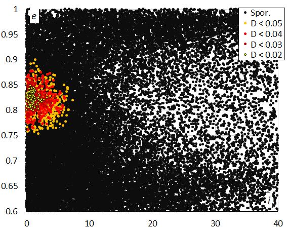 Figure 15 – Eccentricity e versus the inclination i color-coded for different classes of D-criteria thresholds, for λʘ between 326° and 341°.