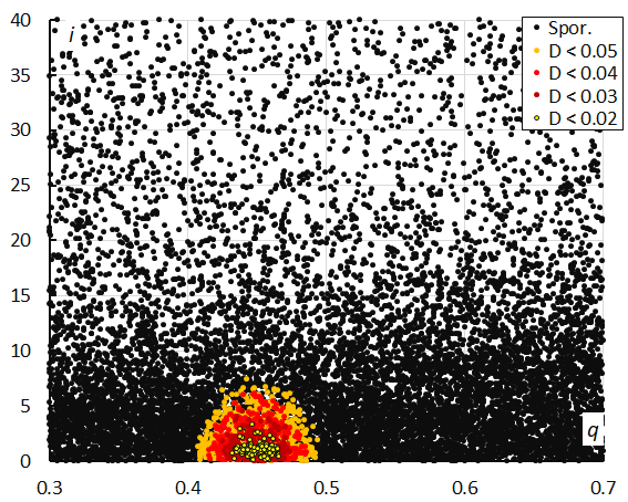 Figure 17 – Inclination i versus the perihelion distance q color-coded for different classes of D-criteria thresholds, for λʘ between 326° and 341°.