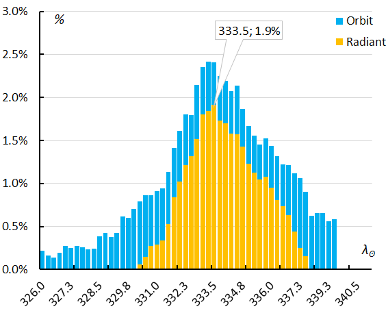 The orbit classification method detects a longer activity period than the period assumed for the radiant classification method. Plotting the ratio M2026-D1 meteors/all meteors in Figure 12, for time intervals of 2° in Solar Longitude, plotted every 0.25°, results in a skewed profile with a steep incline followed by a slower decline in activity. The orbit method (blue) identified more M2026-D1 candidates than the radiant method (orange).