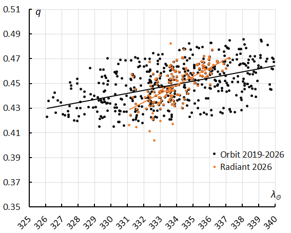 Figure 18 – The evolution of the perihelion distance q in function of the Solar Longitude λʘ for the M2026-D1 based upon orbits (2019–2026) and radiant classification (2026).