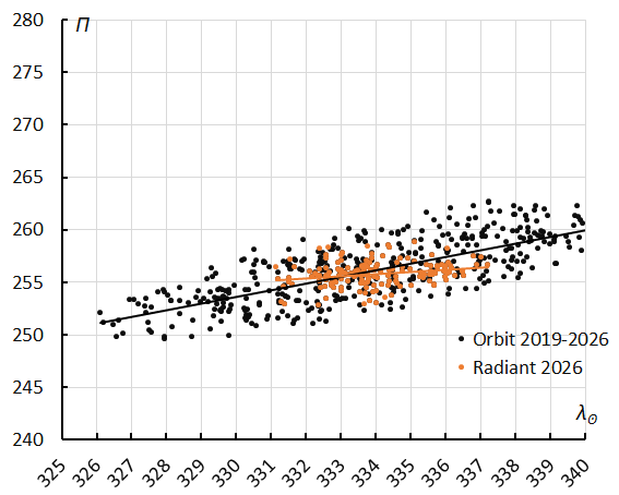 Figure 19 – The evolution of the Longitude of perihelion Π in function of the Solar Longitude λʘ for the M2026-D1 based upon orbits (2019–2026) and radiant classification (2026).
