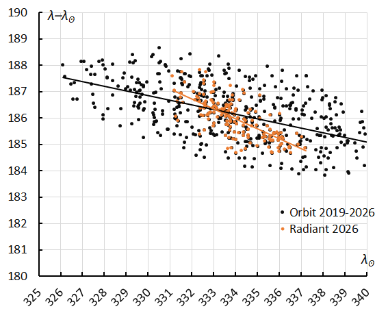 Figure 10 – The Sun-centered geocentric longitude λ–λʘ in function of the Solar Longitude λʘ for M2026-D1 based upon orbits (2019–2026) and radiant classification (2026).