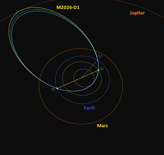 The M2026-D1 meteoroid stream has a Jupiter-family comet type orbit with a Tisserand value relative to planet Jupiter of TJ = 2.77. The stream is only slightly declined to the ecliptic plane and has its aphelion near the orbit of Jupiter. The stream intersects the Earth orbit at its descending node. The ascending node is slightly inside the orbit of Venus, which may cause a meteor shower on planet Venus. The stream is exposed to gravitational perturbations at close encounters to planets Earth, Jupiter, Mars and Venus. The enhanced activity in 2026 may be related to a dust trail formed by these perturbations. The number of orbits per year reflects the expansion of GMN in its early years but the camera coverage has not changed much since 2023. The number of M2026-D1 meteors in 2026 (Table 2) was much higher than in previous years. No trace of this shower could be found in older visual observations.