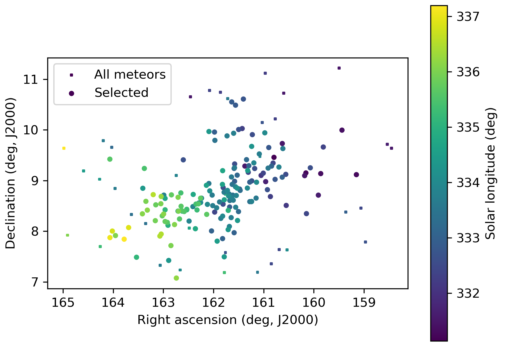 Figure 4 – The radiant distribution during the solar-longitude interval 331° – 337° in equatorial coordinates in 2026.