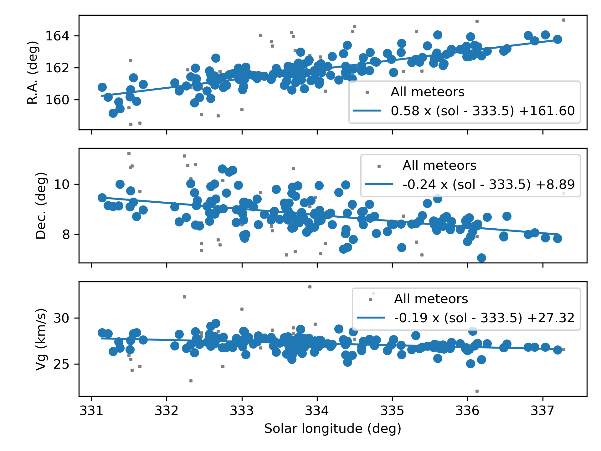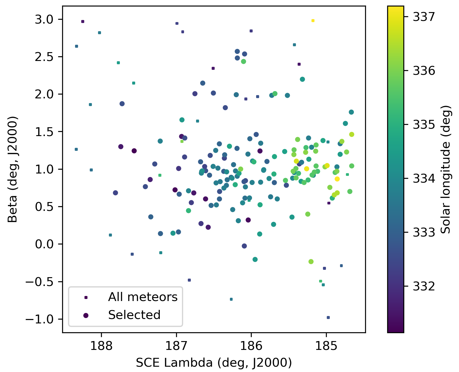Both Figure 8 in Equatorial coordinates and Figure 9 in Sun-centered ecliptic coordinates show the M2026-D1 radiant embedded in the sporadic background. In Equatorial coordinates the radiant appears elongated due to the radiant drift caused by the movement of the Earth on its orbit. In Figure 9 the radiant appears more compact because there is only a small drift with Δ(λ–λʘ) = –0.38°/degree in λʘ due to the change in orbit orientation during Earth’s transit (Figure 10). The ecliptic latitude β shows no trend (Figure 11).