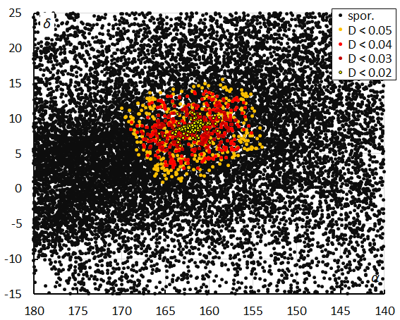 The radiant is located within the anti-helion source, an area of the sky that is densely populated with sporadic radiants. This shower probably did not catch the attention in the past as it couldn’t easily be distinguished from the dense sporadic background. The orbit classification method results in a larger scattered radiant than what has been used for the radiant shower classification.