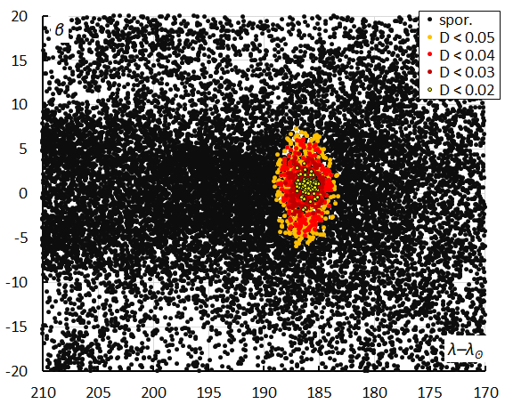 Figure 9 – The radiant distribution during the solar-longitude interval 326° – 341° in Sun-centered geocentric ecliptic coordinates, color-coded for different threshold values of the combined similarity criteria.