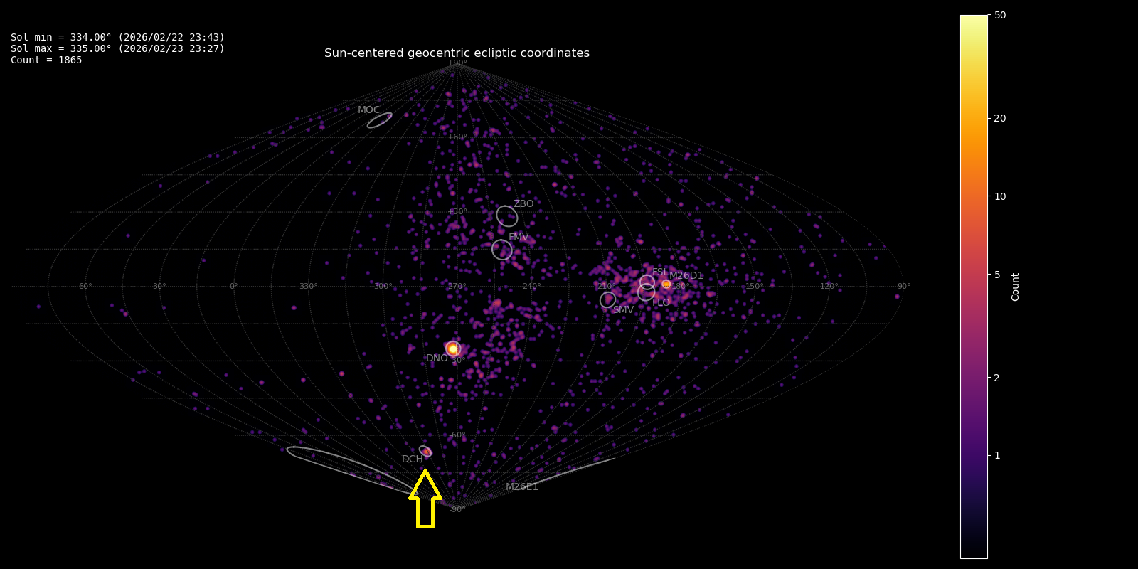 Figure 1 – Radiant density map with 1865 radiants obtained by the Global Meteor Network during 22–23 February, 2026. The position of the delta-Chamaeleontids in Sun-centered geocentric ecliptic coordinates is marked with a yellow arrow.