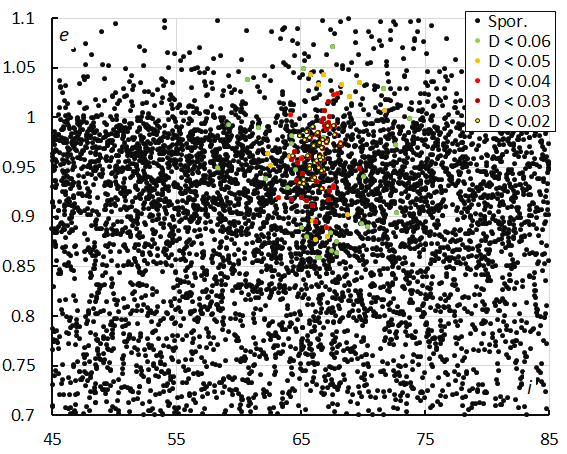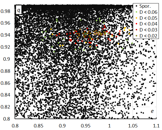 Figure 14 – Perihelion distance q versus the eccentricity e color-coded for different classes of D-criteria thresholds, for λʘ between 330° and 338°. Spor. = sporadics.