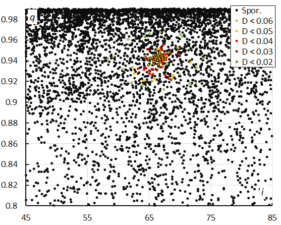 Figure 13 – Perihelion distance q versus the inclination i color-coded for different classes of D-criteria thresholds, for λʘ between 330° and 338°. Spor. = sporadics.