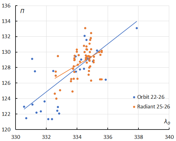 Figure 11 – The evolution of the Longitude of Perihelion Π in function of the Solar Longitude λʘ based upon the radiant method (2025–2026) and upon the orbit method (2022–2026).