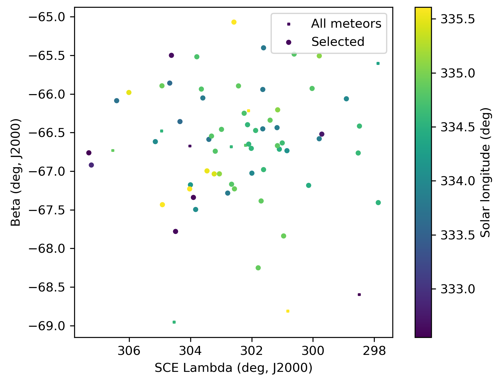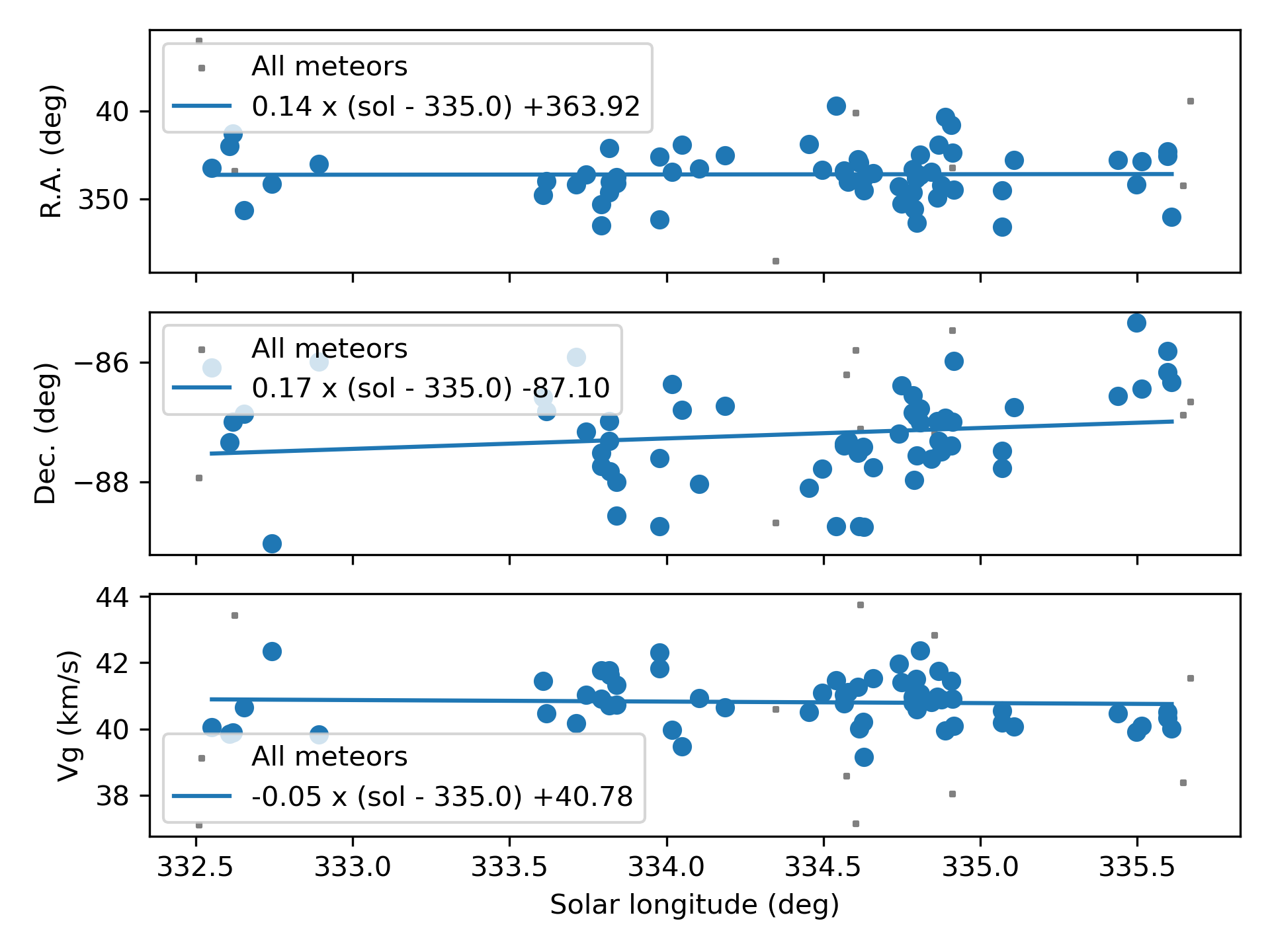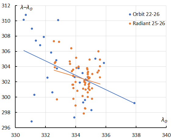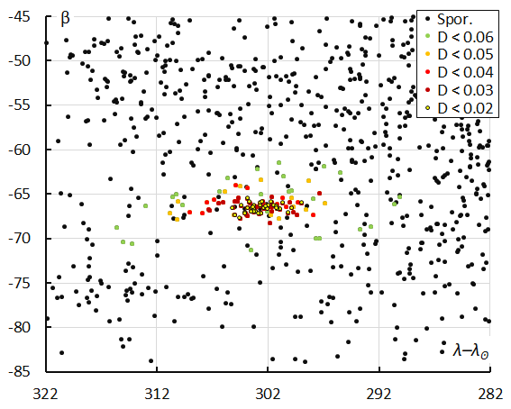 The green dots in Figure 6 with DSH < 0.15 and DD < 0.06 and DJ < 0.15 appear rather dispersed and were ignored as outliers. The cutoff for the thresholds on the D criteria was set at DSH < 0.125 and DD < 0.05 and DJ < 0.125. The Sun-centered ecliptic longitude appears stretched in Figure 6 due to the radiant drift Δ(λ–λʘ)/Δλʘ with –0.59°/Δλʘ (Figure 7). No drift in ecliptic latitude occurs.