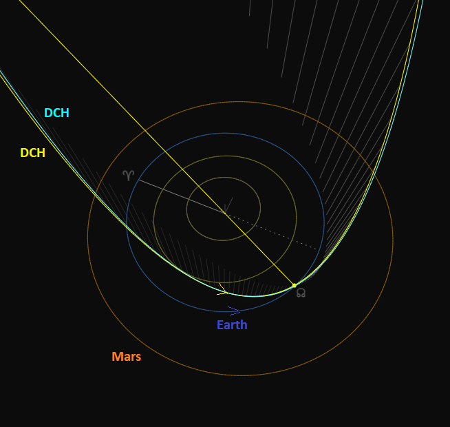 Figure 15 – Comparing the radiant determined delta-Chamaeleontids solution (yellow) with the orbit determined solution (blue). (Plotted with the Orbit visualization app provided by Pető Zsolt).