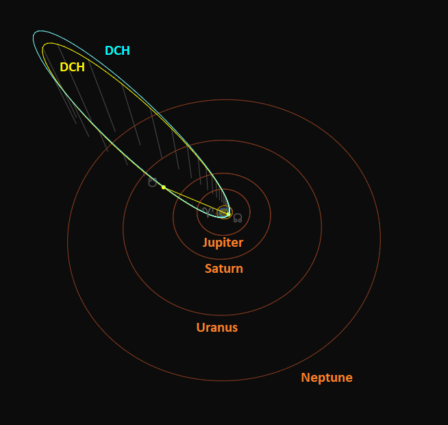 With a Tisserand value relative to Jupiter of TJ = 0.70 the delta-Chamaeleontids are a long-period comet type meteoroid stream steeply inclined to the ecliptic (Figure 15). The meteoroids cross the Earth orbit at the ascending node (Figure 16). The descending node is situated in the ecliptic plane between the orbits of Saturn and Uranus.