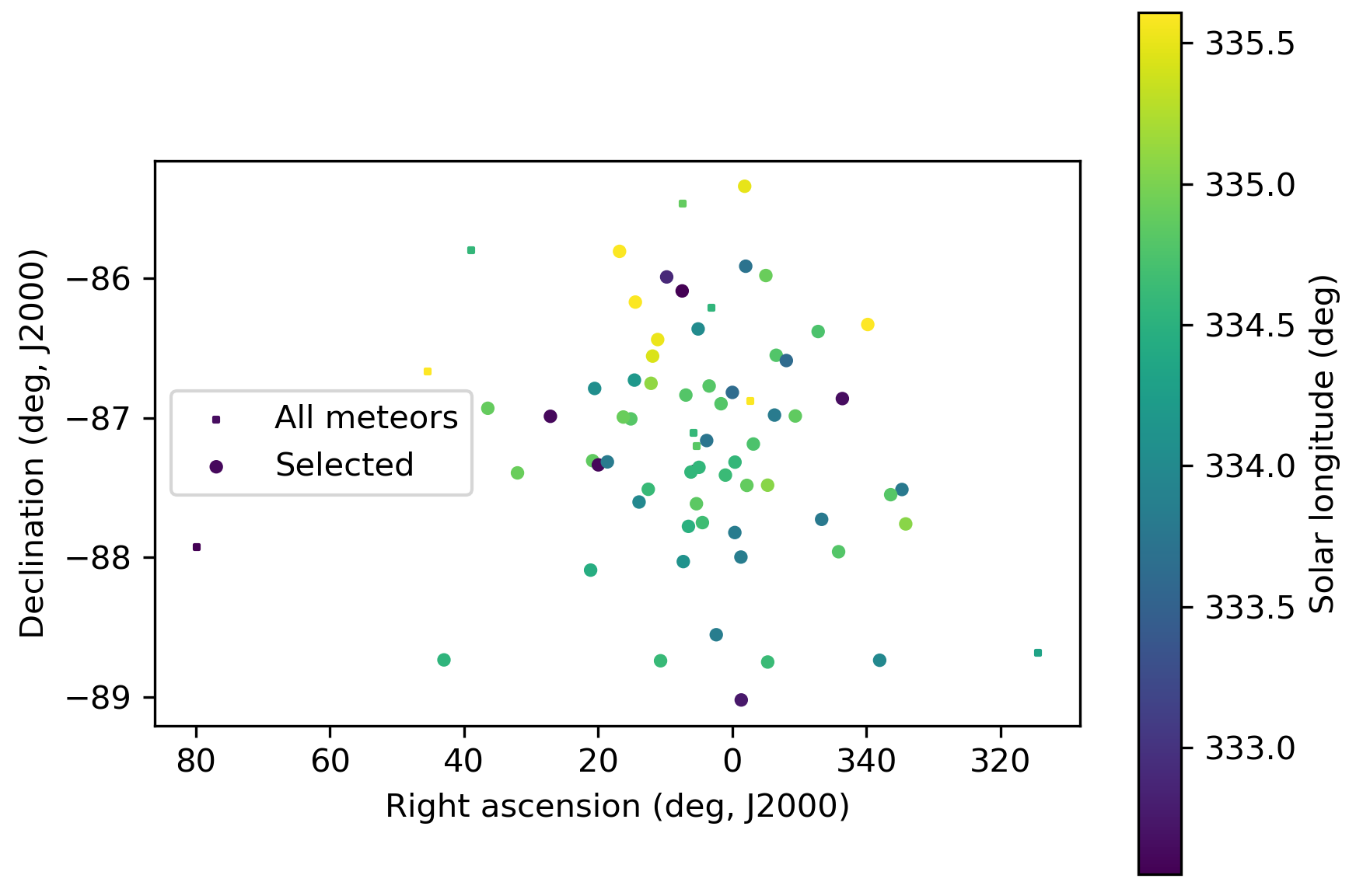 Figure 3 – The radiant distribution during the solar-longitude interval 332.5° – 335.5° in equatorial coordinates.