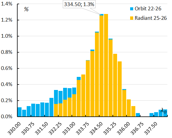 The orbit classification method detects a longer activity period than the period assumed for the radiant classification method. Plotting the ratio delta-Chamaeleontids meteors/all meteors, for time intervals of 1.5° in Solar Longitude, plotted every 0.25°, results in a skewed profile with a slow incline followed by a steep decline in activity (Figure 8). The orbit method (blue) identified more delta-Chamaeleontids candidates than the radiant method (orange). The best rates occurred at λʘ = 334.5°. The shower activity duration lasts one week from 19 until 26 February making it very unlikely that the 1969 radar data recorded between 10 and 17 February includes any data related to the currently known delta-Chamaeleontids.
