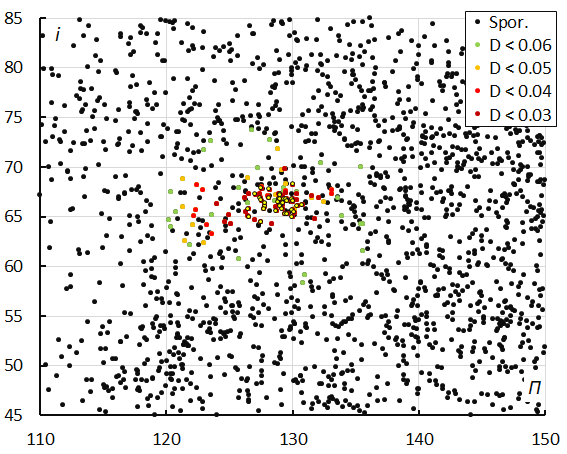 Figure 9 – Inclination i versus the longitude of perihelion Π color-coded for different classes of D-criteria thresholds, for λʘ between 330° and 338°. Spor. = sporadics.