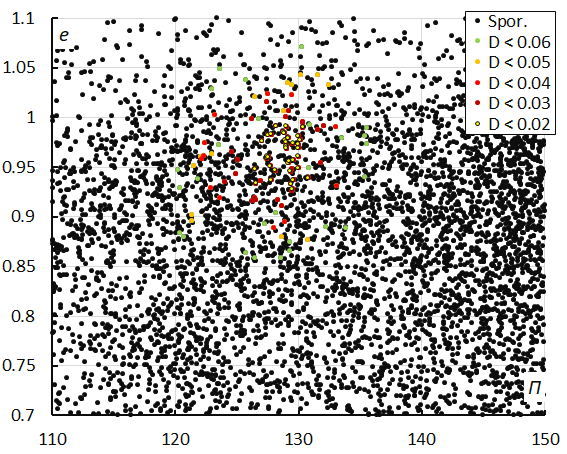 Figure 10 – Eccentricity e versus the longitude of perihelion Π color-coded for different classes of D-criteria thresholds, for λʘ between 330° and 338°. Spor. = sporadics.