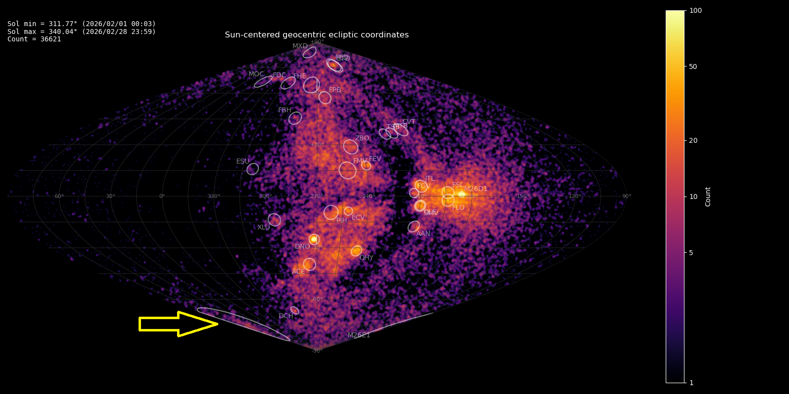 Figure 1 – Radiant density map with 36621 radiants obtained by the Global Meteor Network during February, 2026. The position of the M2026-E1 radiant in Sun-centered geocentric ecliptic coordinates is marked with a yellow arrow.