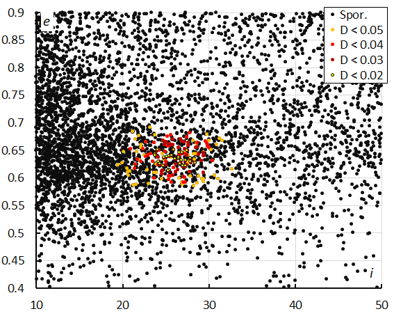 Figure 15 – Eccentricity e versus the inclination i color-coded for different classes of D-criteria thresholds, for λʘ between 322°and 339°.
