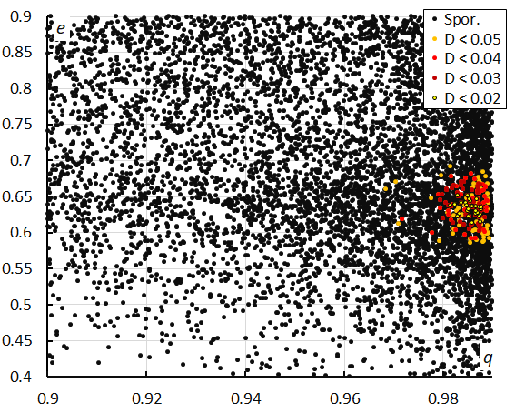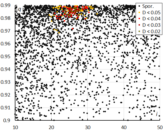 The concentration in orbits is best visible in eccentricity e and perihelion distance q (Figures 15, 16 and 17).