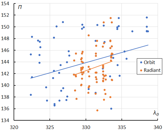 Figure 14 – The evolution of the Longitude of perihelion Π in function of the Solar Longitude λʘ for the M2026-E1 based upon orbits (2022–2026) and radiant classification (2026).