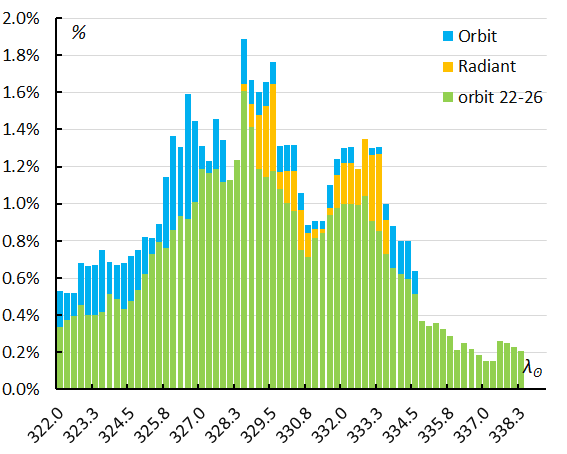Figure 11 – The percentage of M2026-E1-meteors relative to the total number of meteors at the Southern Hemisphere, for the radiant method 2026 (orange), the orbit classification method 2026 (blue) and orbit classification method 2022–2026 (green).