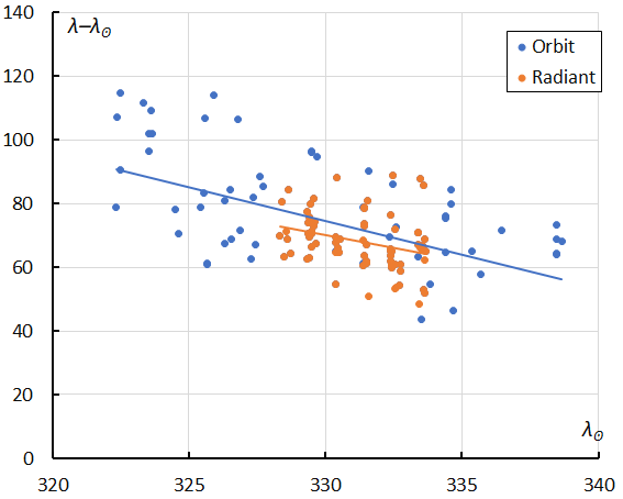 Figure 10 – The Sun-centered geocentric longitude λ–λʘ in function of the Solar Longitude λʘ for M2026-E1 based upon orbits classification (2026) and radiant classification (2026).