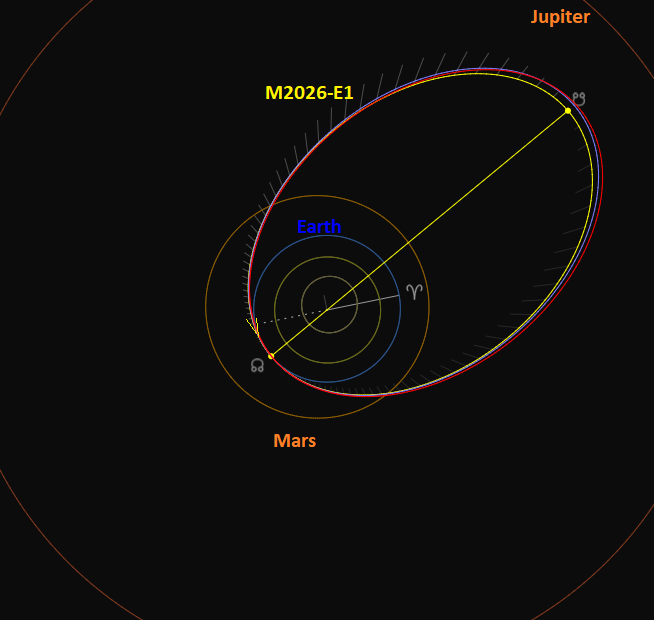 The M2026-E1 meteoroid stream has a Jupiter-family comet type orbit with a Tisserand value relative to planet Jupiter of TJ = 2.96. The meteoroid stream intersects the Earth orbit at its ascending node (Ω) while the descending node (℧) is situated between the asteroid belt and Jupiter (Figure 18).