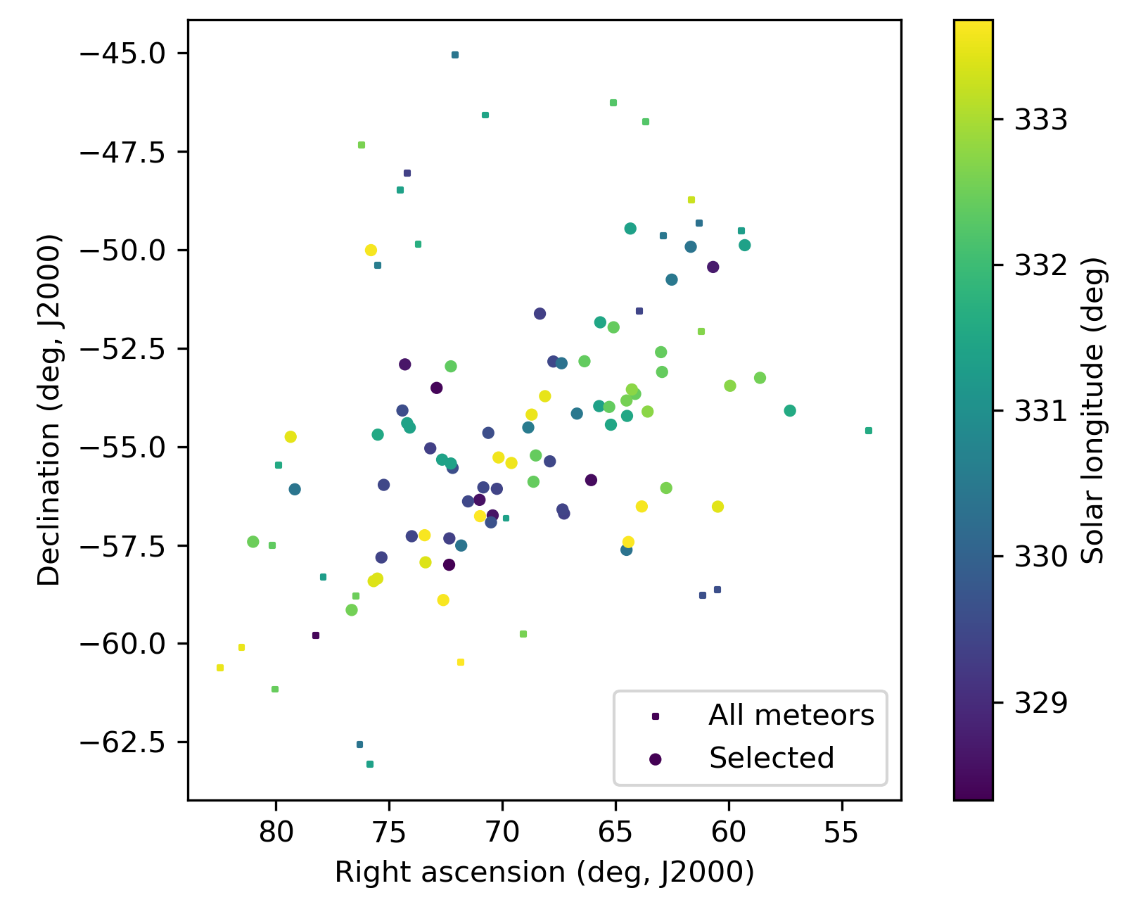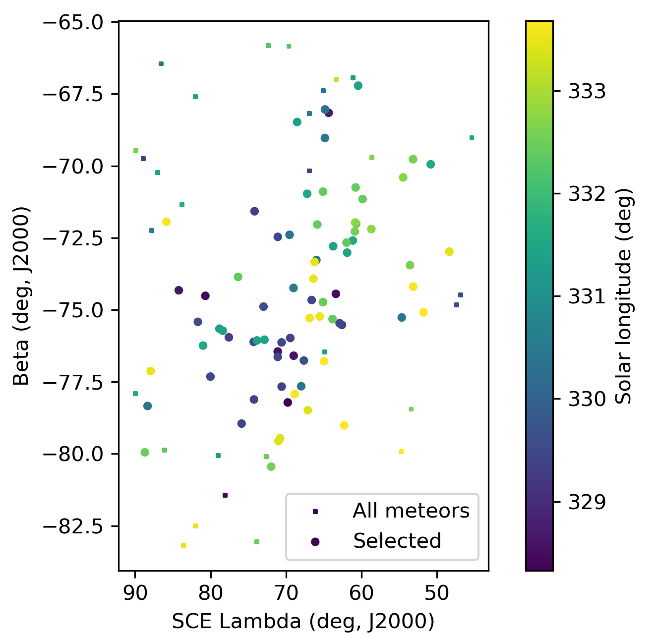 Figure 5 – The radiant distribution during the solar-longitude interval 328° – 334° in Sun-centered geocentric ecliptic coordinates.
