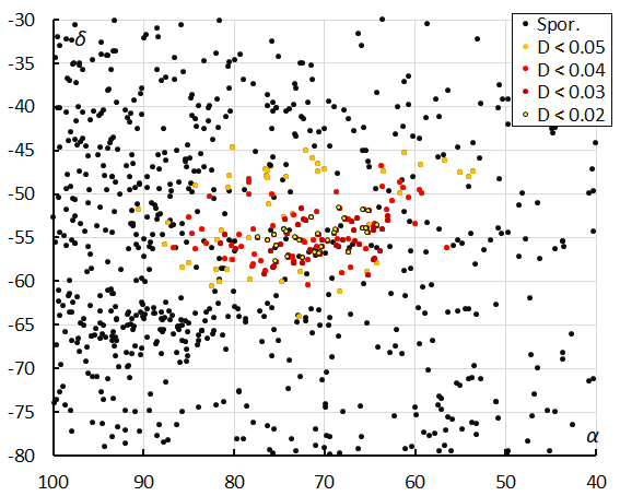 Figure 7 – The radiant distribution during the solar-longitude interval 322° – 339° in equatorial coordinates, color-coded for different threshold values of the combined similarity criteria.