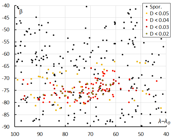 Figure 8 – The radiant distribution during the solar-longitude interval 322° – 339° in Sun-centered geocentric ecliptic coordinates, color-coded for different threshold values of the combined similarity criteria.