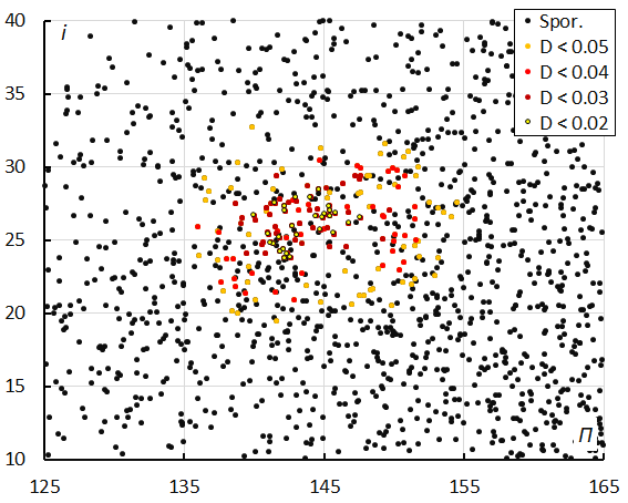 Figure 12 – I inclination i versus the longitude of perihelion Π color-coded for different classes of D-criteria thresholds, for λʘ between 322°and 339°.