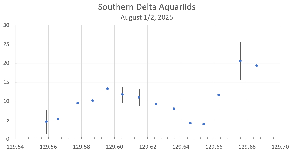 So the question is, is this increased SDA activity? Comparison with the video ZHR curve from the GMN video network indicates a peak in activity around λ=129.5 during this night with a ZHR of 17. Again, these are two completely different observation techniques. But the fact that both techniques find a peak around the same time is interesting.