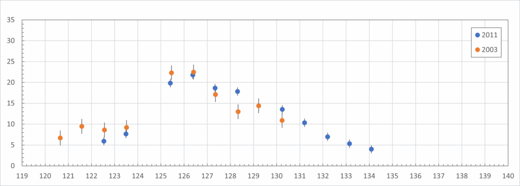 Two things stand out when comparing 2025 with 2011. Almost the entire 2025 graph is 30 to 40% lower in activity than 2011. Before this analysis began, Thomas Weiland, observing from Crete, reported seeing roughly 30% fewer SDAs compared to previous observations from that location. What is higher than the 2011 graph are the two points at λꙨ = 129.0 and 129.6. These may also indicate increased SDA activity. This will be discussed in the next chapter.