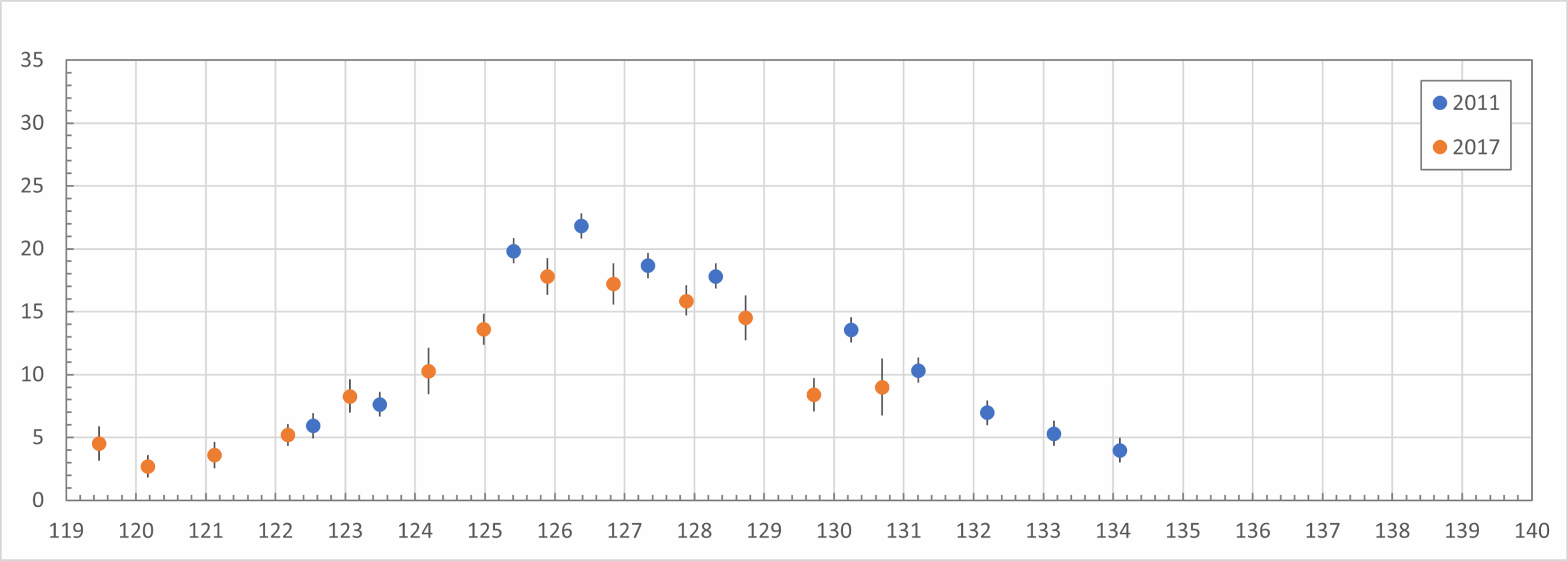 The entire 2017 graph follows the 2011 pattern fairly closely, but is slightly lower across the board.