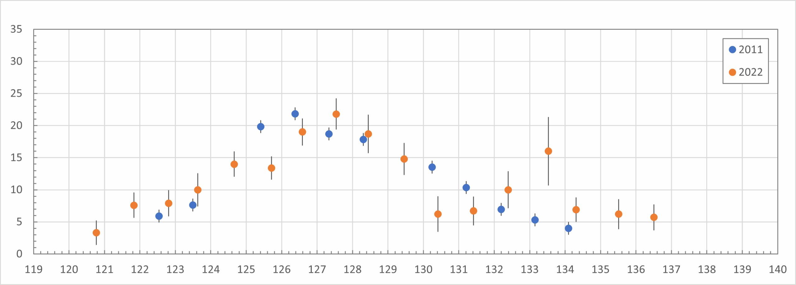 The 2022 graph also shows a somewhat erratic pattern compared to 2011. A striking feature is the ZHR of 16 ±5 at λꙨ=133.5 (August 6, 2022, 7.4 UT). This data comes from an experienced observer, but with a relatively low radiant height. Comparing the graph with video data from the SDA’s GMN network in 2022 (see Figure 8 in the next chapter), there is no evidence of increased activity. Furthermore, it is notable that the maximum ZHR in 2022 (λꙨ=127.5) falls later than what I find in previous years. This ZHR point is most likely due to increased SDA activity. More on this in the next chapter.