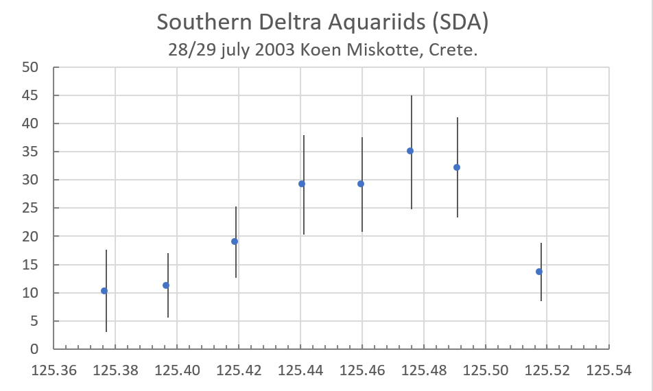 In 2003 the author stayed at a small holiday park near Ferma, on the south coast of Crete, from July 20th to August 3rd [8]. Observations were possible there for 10 nights [11]. On the night of July 28th/29th, the sky was crystal clear and very transparent. After 23:30 UT, the SDA activity increased, shortly turning into a spectacular display. Many SDAs were observed in a short period. For example, between 23:40 and 00:52 UT, 36 SDAs were observed (see table 5). These are numbers only observed during a normal maximum in Namibia or La Palma. In 2011, observations were again possible from Namibia around the same solar longitude, but no increased activity was observed [5, 6].