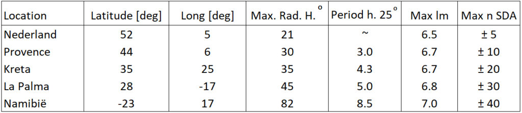 Table 1: Overview of several SDA observation locations. Column 5 shows the number of hours the SDA radiant is above 25 degrees height.